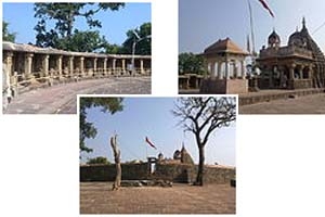 The Chausath-Yogini temple is situated atop a hill rock and approached by a long flight of steps. Dedicated to Lord Shiva, this c. 10th century CE temple has carved stone figures of deities belonging to the Kalchuri period, arranged in a circular order. According to local legends, this ancient temple is connected to the Gond Queen-Mother Durgavati's palace of Singaurgarh in Sangrampur as well as to the Maharaja Madansahi's Madan-Mahal bastion through underground passages. These passages offered safety to the visiting royalties in addition to allowing escape route in times of distress.