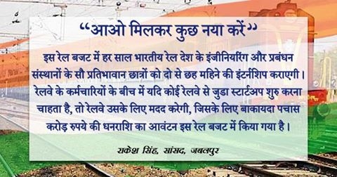 रेलवे के कर्मचारियों के बीच में यदि कोई रेलवे से जुडा स्टार्टअप शुरु करना चाहता है, तो रेलवे उसके लिए मदद करेगी, जिसके लिए बाकायदा पचास करोड़ रुपये की धनराशि का आवंटन इस रेल बजट में किया गया है।